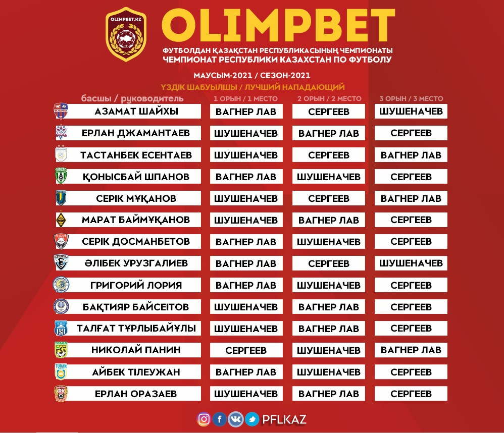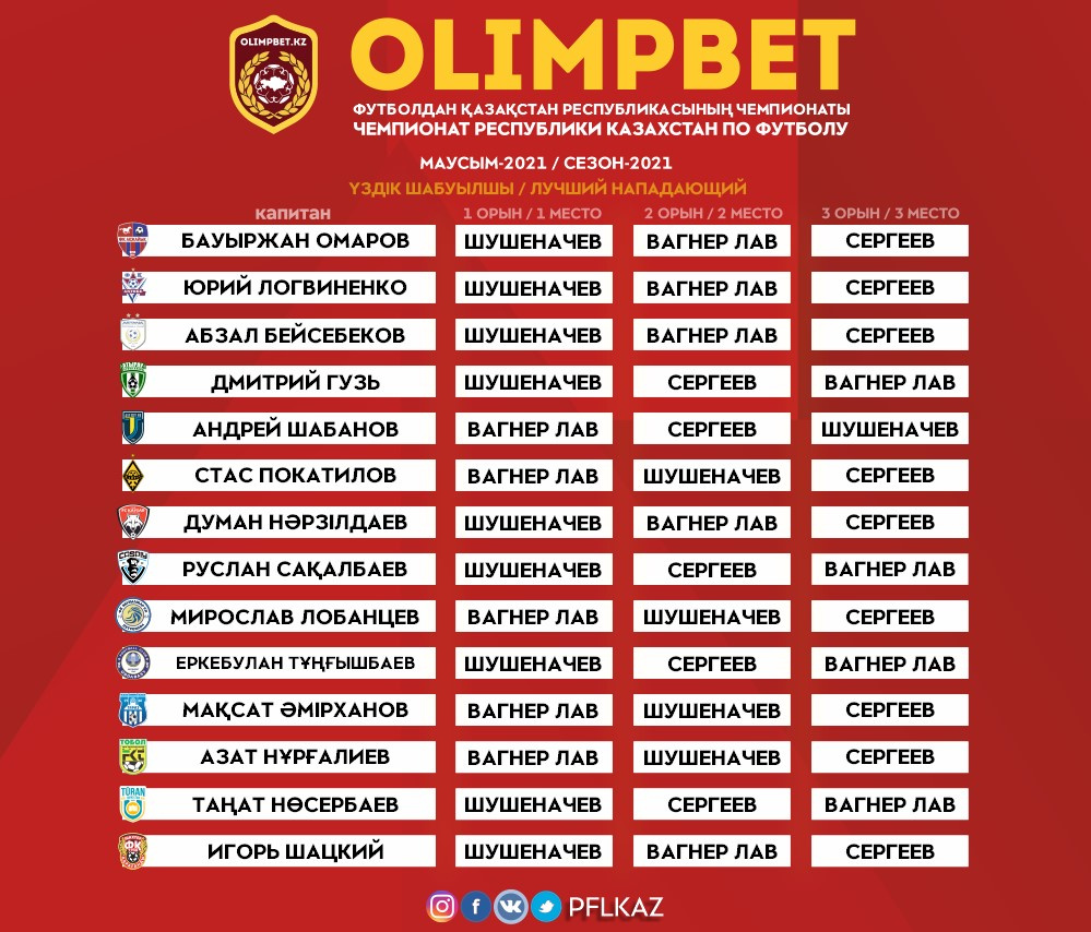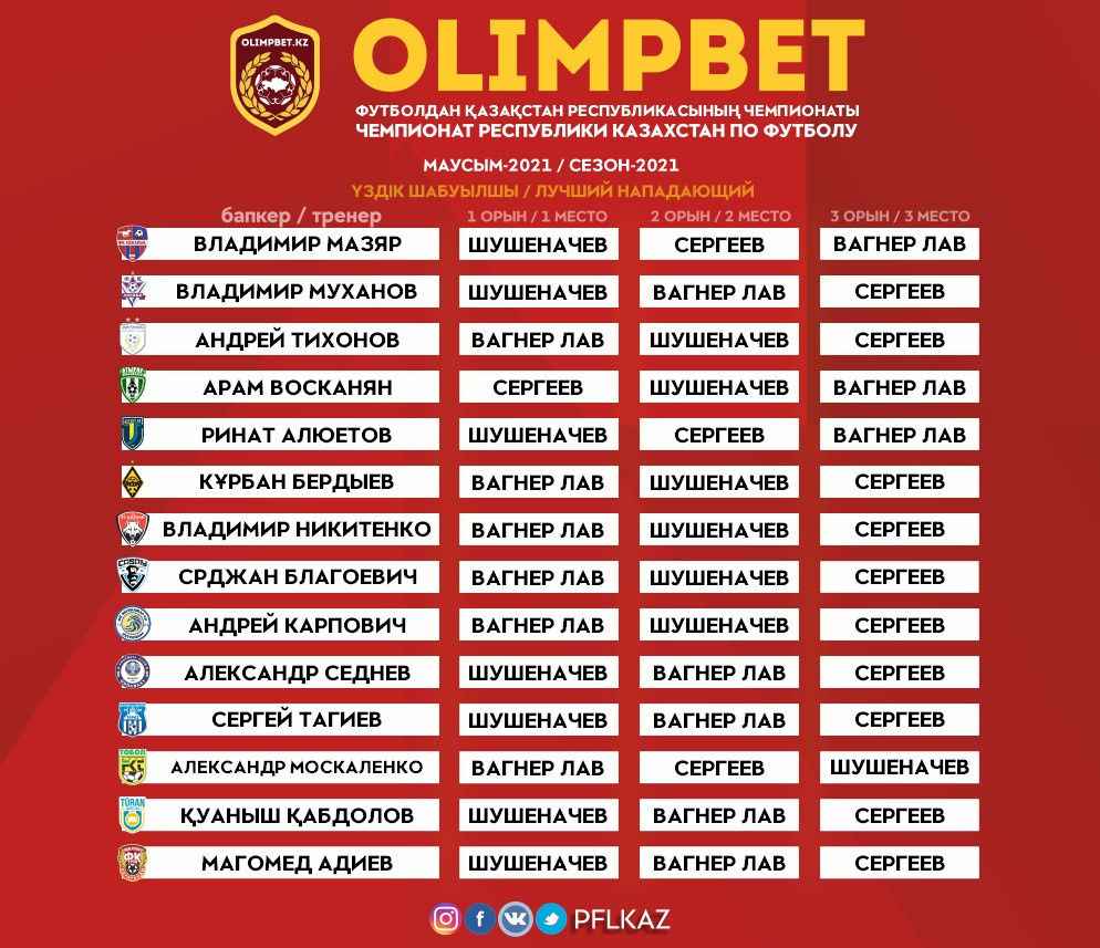 По итогам сезона 2021 года лучшим нападающим стал игрок «Кайрата» и национальной сборной Казахстана Артур Шушеначев. 23-летний футболист в этом сезоне дебютировал в составе главной команды страны, а на клубном уровне стал лучшим бомбардиром Чемпионата среди казахстанских игроков. Всего Шушеначев забил 12 мячей в Чемпионате, 5 – в Кубке, один – в Суперкубке, также 4 раза отметился результативными действиями в еврокубках.