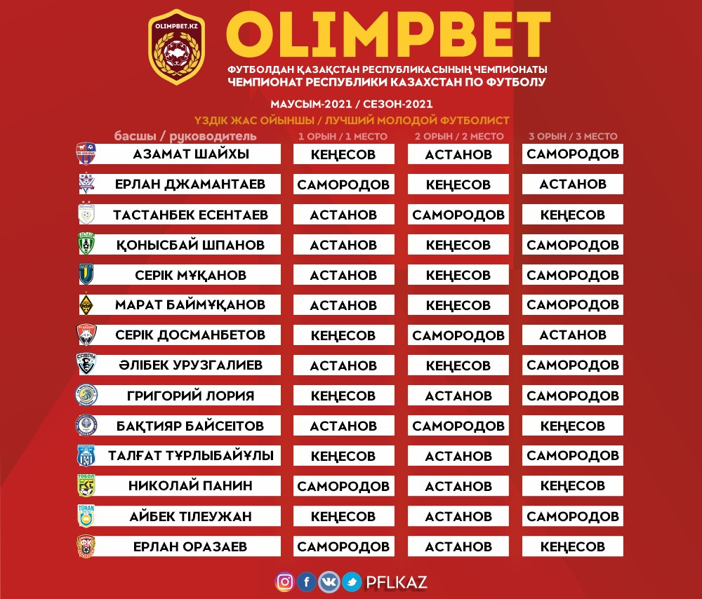 Первым лауреатом этого приза стал 21-летний полузащитник «Ордабасы» и молодежной сборной Казахстана Эльхан Астанов. Именно за него больше всего голосов было отдано в опросе руководителей клубов, капитанов и тренеров команд-участниц Чемпионата Казахстана.