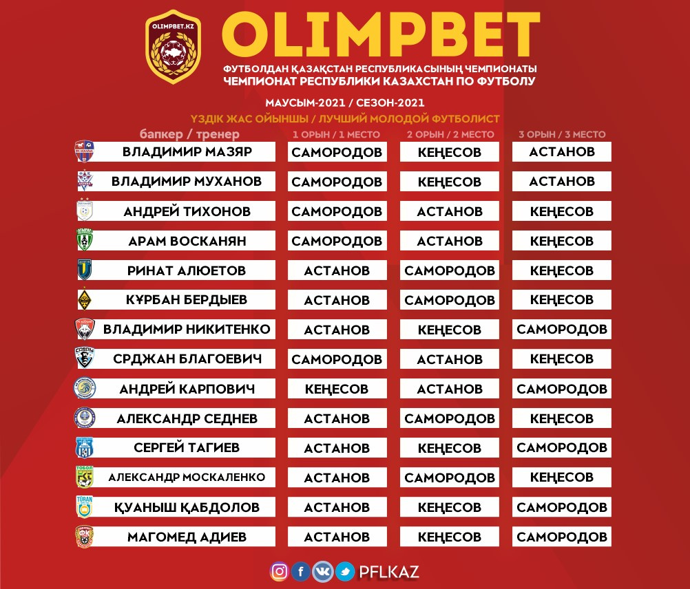 Тройку замкнул 19-летний атакующий хавбек «Актобе» Максим Самородов. Нападающий в марте дебютировал за национальную сборную Казахстана, но на постоянной основе вызывался Кайратом Нурдаулетовым в молодежную сборную. В крайней игре за молодежную сборную Казахстана он стал автором гола в ворота Шотландии.