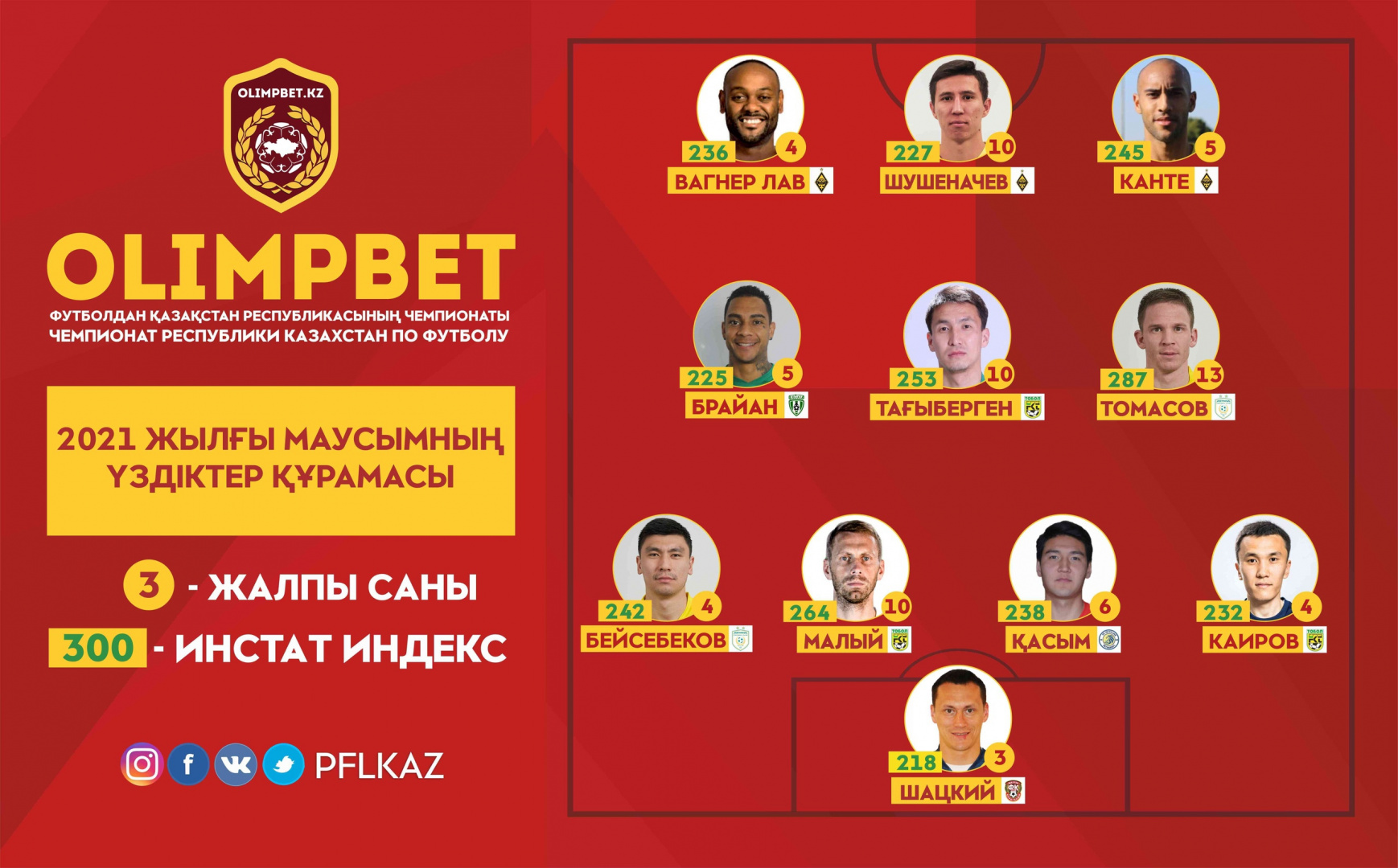Команда сезона была составлена на основе статистического анализа матчей от партнера ПФЛК – компании InStat. При формировании состава сборной учитывался не только общий индекс действий игроков, количество попаданий в сборную тура, но и различные ключевые показатели, характерные для их позиций.