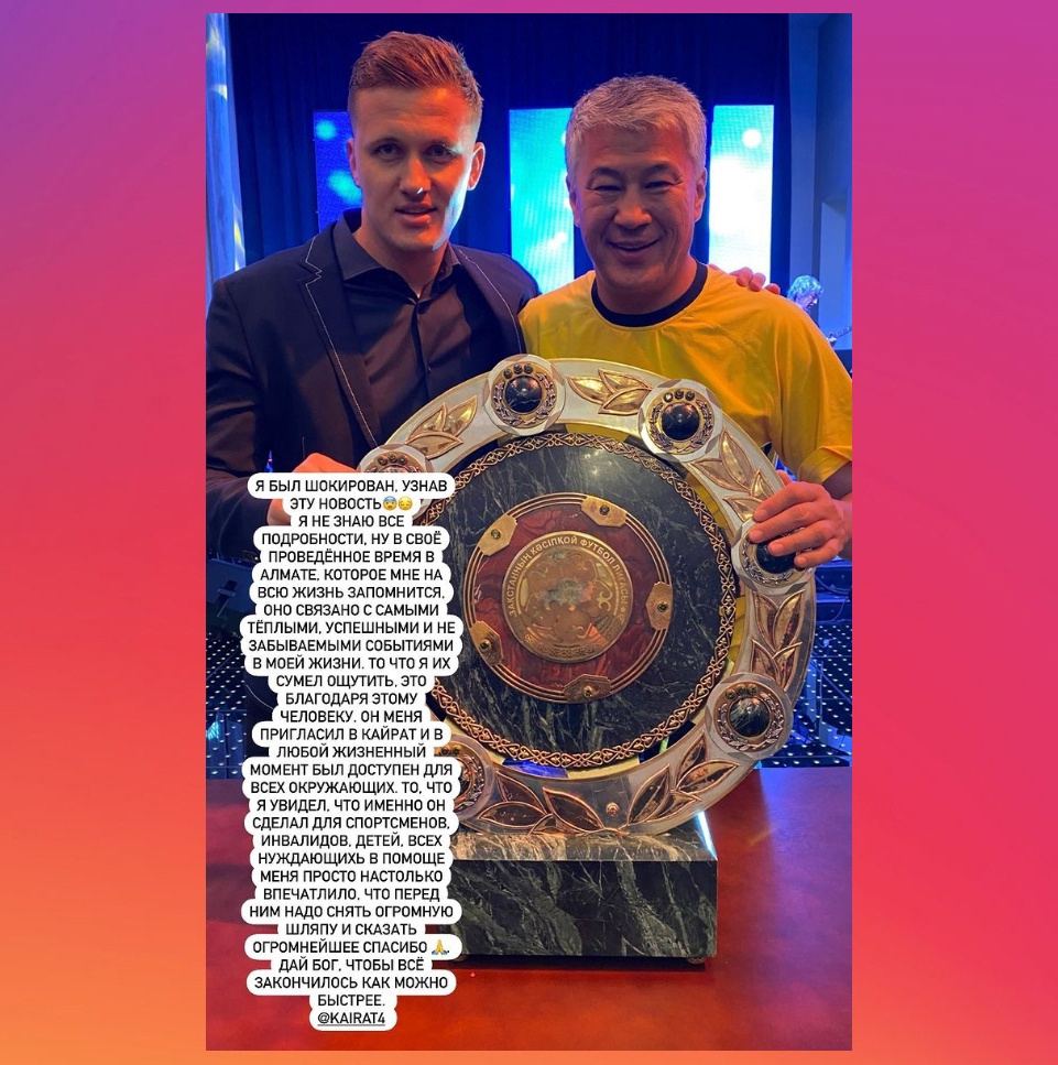 – Я был шокирован, узнав эту новость. Я не знаю все подробности, но в свое проведённое время в Алмате, которое на всю жизнь запомнится, связано с самыми тёплыми, успешными и незабываемыми событиями в моей жизни. То что я сумел их ощутить – это благодаря этому человеку. Он меня пригласил в «Кайрат» и в любой жизненный момент был доступен для окружающих. То, что я увидел, что именно он сделал для спортсменов, инвалидов, детей и всех нуждающихся в помощи меня просто настолько впечатлило, что перед ним надо снять огромную шляпу и сказать огромнейшее спасибо. Дай Бог, чтобы всё закончилось как можно скорее.