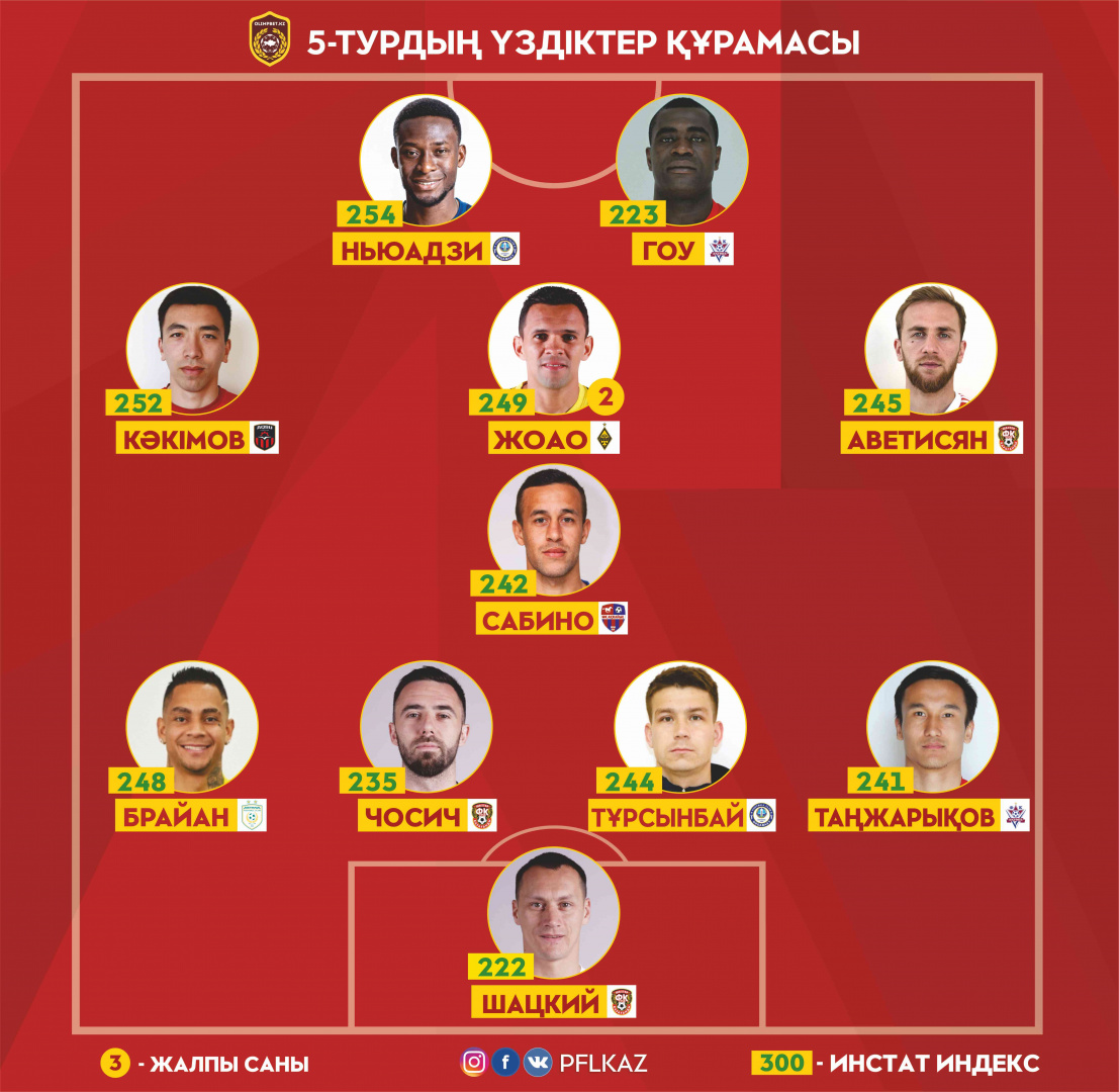 Турсынбай стал лидером тура из числа защитников по количеству успешных отборов – 5. При этом Сагадат сумел совершить 11 перехватов и выиграл 16 единоборств. Индекс действий – 244.