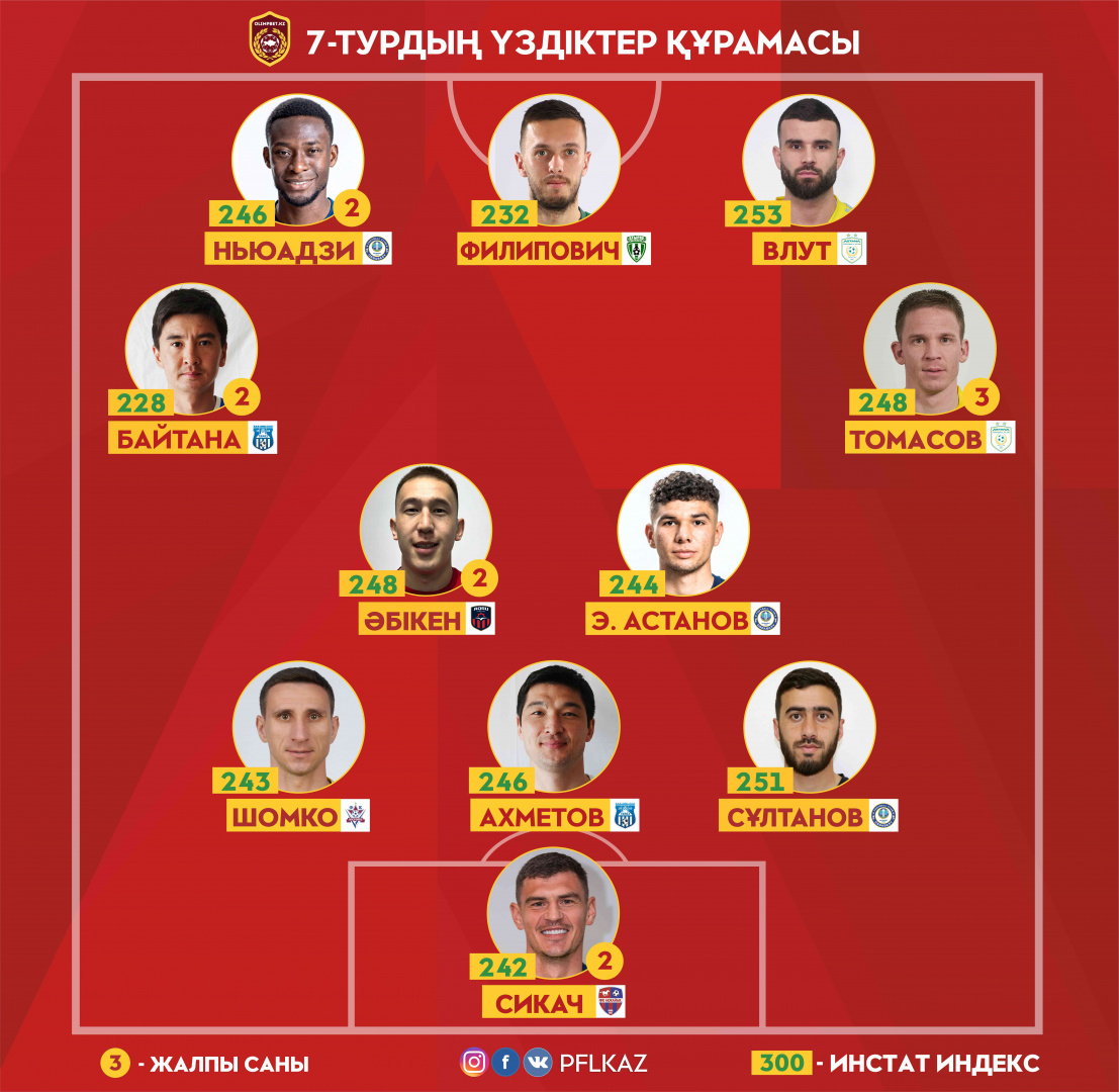 Серж Ньюадзи также был неудержим в атаке. Сначала нападающий «Ордабасы» забил шикарный гол ударом головой, затем воспользовался грубой ошибкой обороны соперника. Доведя свой бомбардирский запас до 5-ти голов, Ньюадзи догнал лучшего бомбардира Чемпионата Канте. Индекс действий – 246.