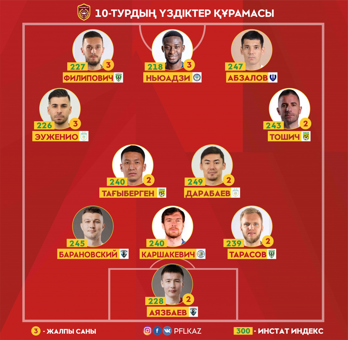 Лучшим же форвардом тура стал Шохан Абзалов, забивший оба мяча «Турана» в ворота «Шахтера». При этом казахстанский форвард выиграл 12 единоборств, 4 раза успешно обыграл соперника и нанес 5 ударов. Индекс действий - 247.