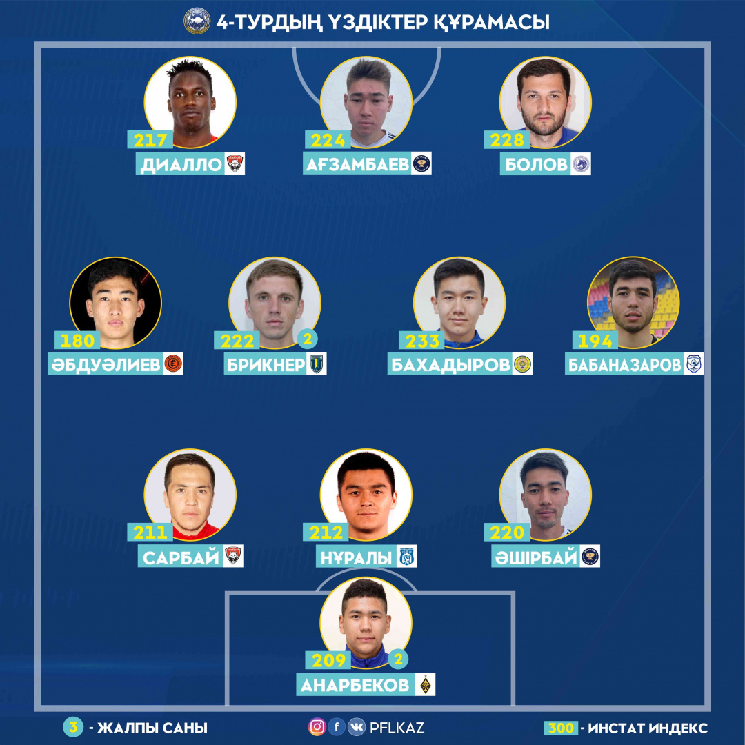 Нурдаулет Агзамбаев и Адама Диалло в матчах четвертого тура отметились дублем в ворота «Астана М» и «Шахтер-Булат» соответственно. На счету же Болова победный гол в ворота «Академии Онтустык». При этом Руслан стал лидером тура по количеству выигранных единоборств в атаке – 12. Индекс действий – Болов 228, Агзамбаев 224, Диалло 217.