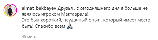 «Друзья, с сегодняшнего дня я больше не являюсь игроком «Мактаарала»! Это был короткий, неудачный опыт, который имеет место быть! Спасибо всем», – написал Бекбаев.