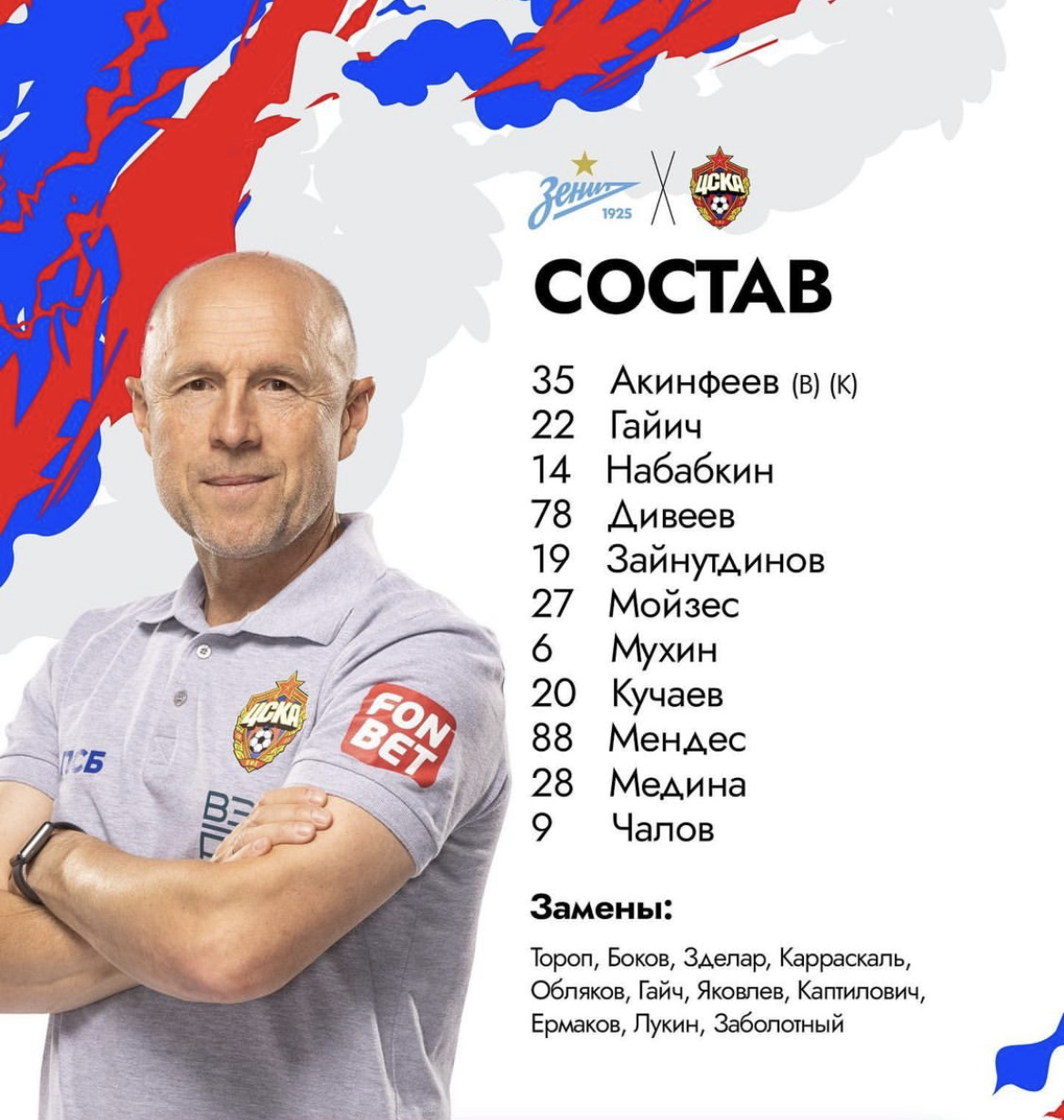 Зайнутдинов попал в стартовый состав ЦСКА на матч пятого тура РПЛ против «Зенита» Алипа