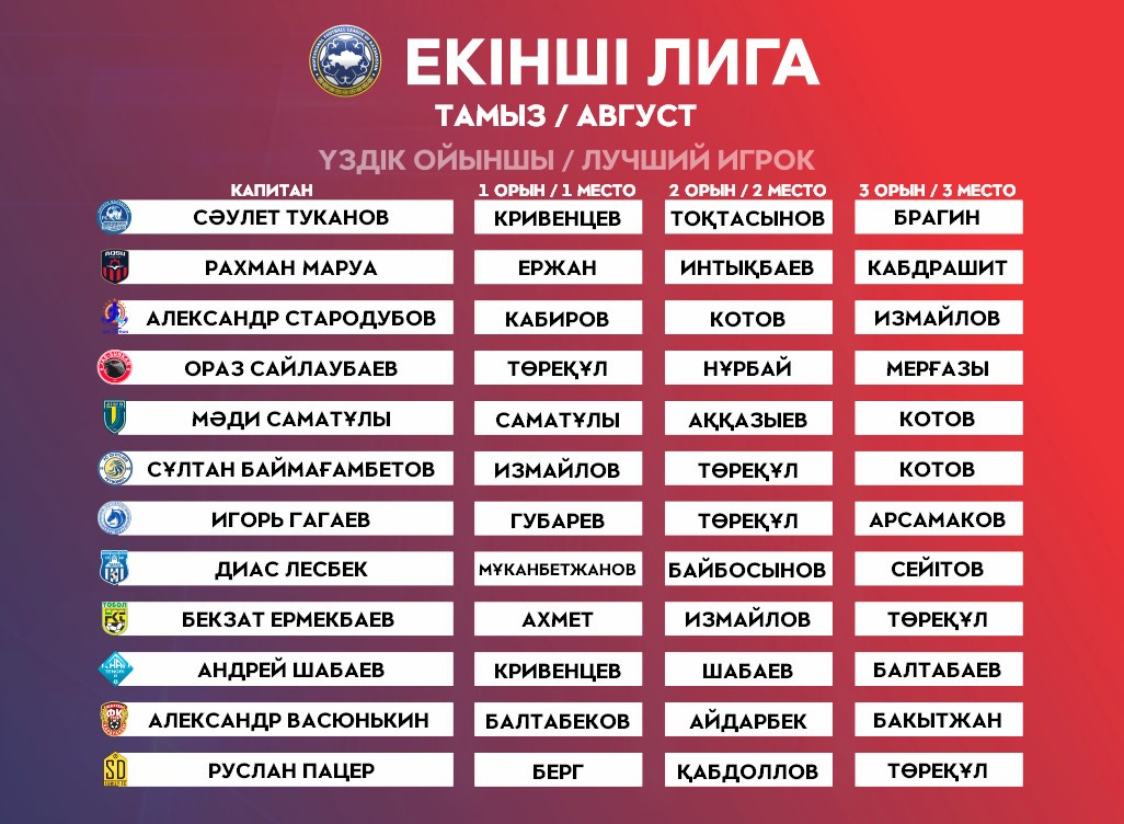 Второе и третье место между собой поделили атакующие футболисты «Кызыл-Жара» Алмас Измайлов и «Хан-Тенгри» Павел Кривенцев.