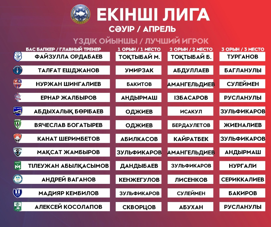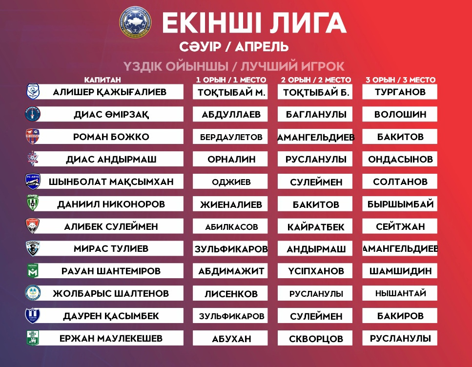 По итогам голосования лучшим игроком месяца становится нападающий «Туран М» Бакдаулет Зульфикаров. В августе форвард забил 4 гола, упрочив свое лидерство в списке бомбардиров Второй Лиги.