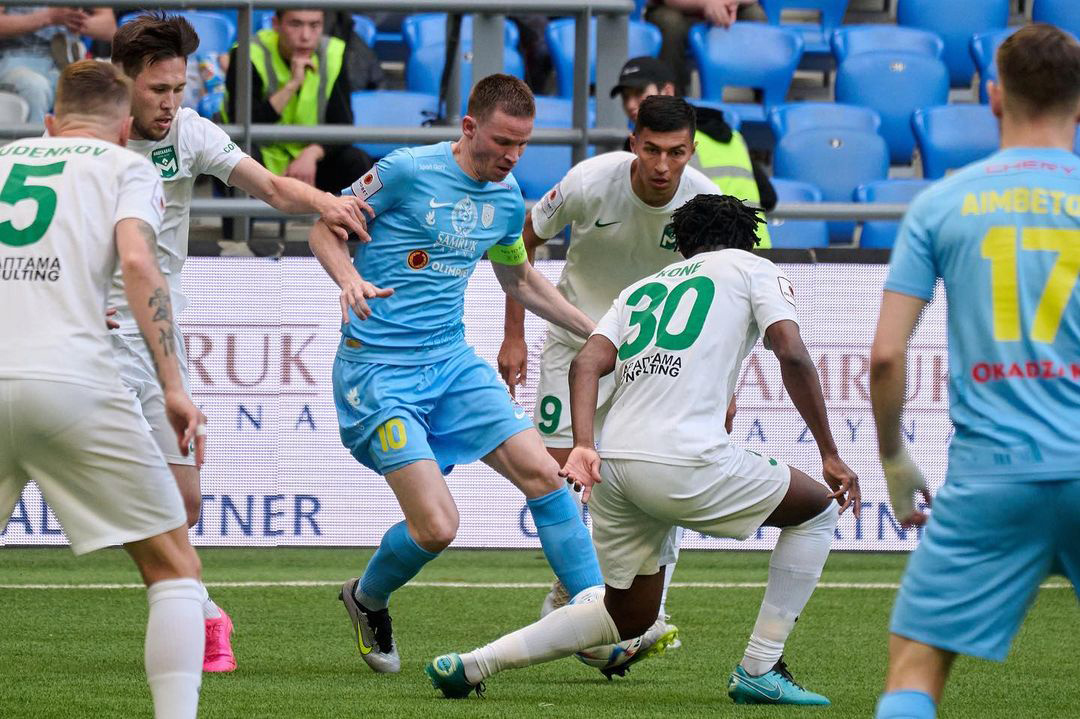 "Красно-белых" обошёл "Ордабасы". Шымкентцы в 8-м туре встретились дома с "Кайсаром". "Южное дерби" обещало получиться жарким, ведь весной кызылординцы выдали победную серию, пока их уверенную поступь не прервала "Астана". Однако в этот раз борьбы не получилось – "Ордабасы" переиграл соперника по всем статьям. Хотя поначалу гостям удавалось сдерживать атаки соперника. В дебюте поединка у шымкентцев отметился ударом из-за штрафной Шохбоз Умаров, но он в дальний угол не попал. В середине первого тайма Сергей Малый откликнулся на подачу с углового, однако с линии вратарской направил мяч рядом с правой штангой. Затем Умаров попытался заработать пенальти, рухнув в чужой штрафной в борьбе с двумя защитниками, но свисток судьи промолчал. Через некоторое время Асхат Тагыберген отметился дальним выстрелом, однако Степан Сикач в падении отразил угрозу. Впрочем, капитан "Ордабасы" пока только пристреливался. На 37-й минуте хозяева заработали перспективный стандарт, и Тагыберген с него пробил точно под дальнюю штангу – 1:0. Асхат показательно не стал праздновать гол в ворота бывшей команды. Затем Бобир Абдихоликов едва не поразил цель из убойной позиции, однако голкипер в падении первым добрался до мяча. Впрочем, в начале второго тайма 45-й номер хозяев добился своего. Ауро вывел на ворота по правому краю Абдихоликова, и тот пробил голкипера – 2:0. Шымкентцы побежали вперёд добивать соперника. Они отметились несколькими опасными дальними ударами, которые цели не достигли. На 68-й минуте у "Кайсара" в редкой контратаке отличился Елжас Алтынбеков, но его гол арбитр не засчитал из-за офсайда. А через пять минут хозяева довели дело до разгрома. Они заработали угловой, Тагыберген навесил в центр на Ерланова, и тот метров с восьми пробил головой в правый нижний угол – 3:0. Но и на этом шымкентцы не остановились. На второй компенсированной минуте после розыгрыша хозяевами очередного углового Ерланов с левого угла штрафной навесил на дальнюю штангу на Максима Федина, тот скинул на Айбара Жаксылыкова, который с нескольких метров поразил цель – 4:0. "Ордабасы" одержал третью крупную победу в сезоне и ворвался в первую тройку.