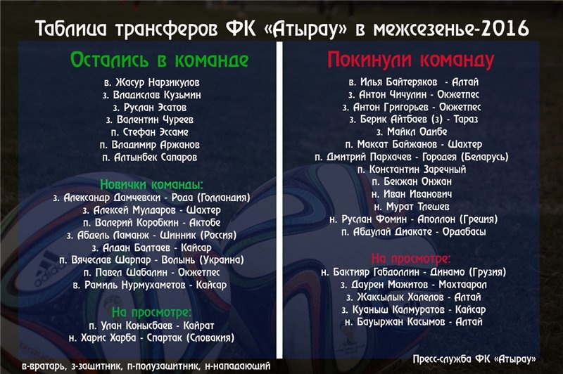 В целом тенденция такова, что команда омолодилась, средний возраст состава стал ниже. На место возрастных футболистов пришли 23-летний Дамчевски, 25-летний Ламанж, 26-летний Балтаев, 28-летний Шарпар, 27-летний Шабалин и 27-летний Нурмухаметов. Старше всех перечисленных лишь 31-летние Мулдаров и Коробкин. Но, куда без них, опытных? В сезоне-2016 состав «Атырау» должен олицетворят сплав опыта и молодости.