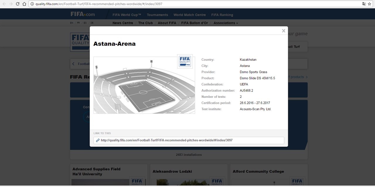 Ежегодно, поле проходит сертификацию искуственного покрытия на соответствие стандартам FIFA. По итогам испытаний 2016 года, для футбольного поля «Астана-Арены» предоставлен сертификат о соответствии стандартам качества FIFA 2 звезды, что подтверждается на сайте http://quality.fifa.com/.