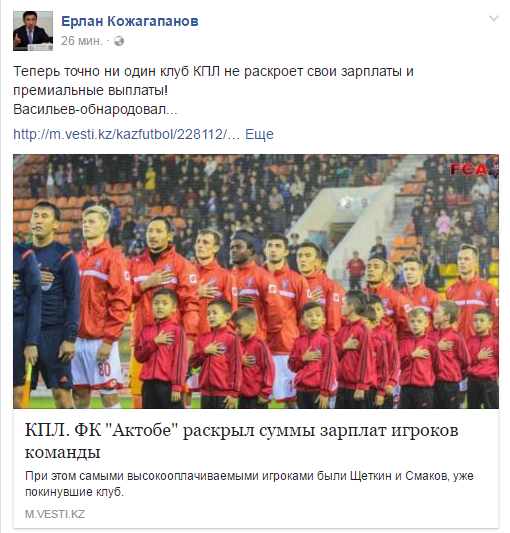 – Теперь точно ни один клуб КПЛ не раскроет свои зарплаты и премиальные выплаты! Васильев – обнародовал…, - написал Кожапаганов, прикрепив новость о раскрытии актюбинским клубом суммы зарплат игроков команды.