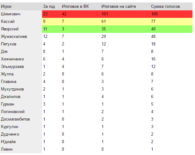 Огромное преимущество дало австрийскому легионеру голосование во ВКонтакте. Здесь 42 из 75 выборщиков отдали ему предпочтение! Фактически 6-кратная разница с ближайшими преследователями - Жумаскалиевым и Кассаем.