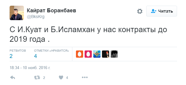 — С Исламбеком Куатом и Бауыржаном Исламханом у нас контракты до 2019 года, — написал Кайрат Боранбаев.