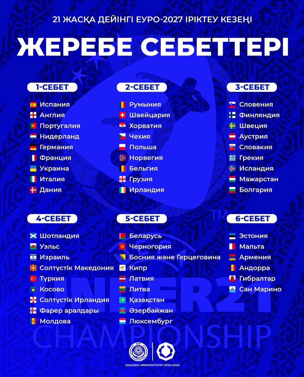Сборная Казахстана U-21 находится в 5-й корзине. По итогам жеребьевки будут сформированы шесть групп по шесть команд и три группы по пять команд. За финальный этап поборются 14 команд.