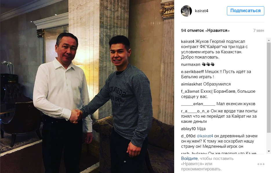 - Жуков Георгий подписал контракт с ФК «Кайрат» на три года, с условием играть за Казахстан. Добро пожаловать, - написал Боранбаев на личной странице в Instagram.