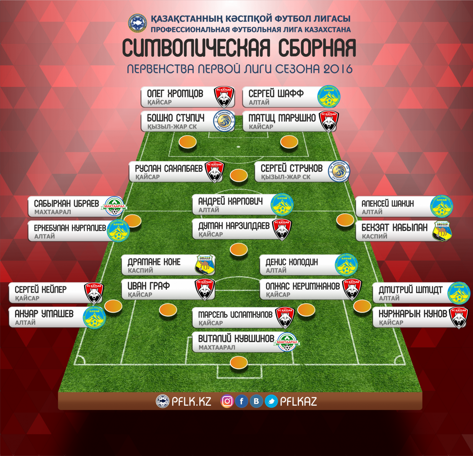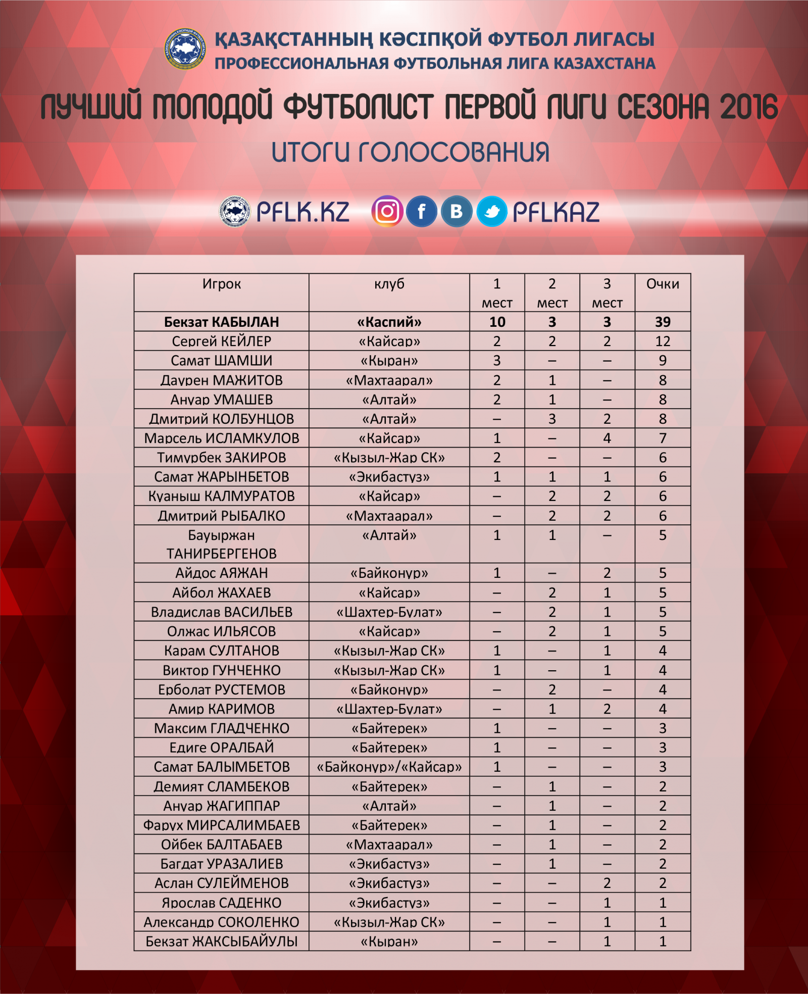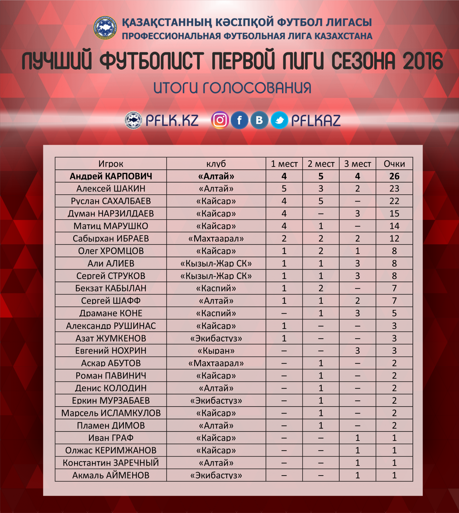 В итоге, звание «Лучший футболист Первой Лиги сезона 2016 года» взял Андрей Карпович, набравший 26 баллов. На счету экс-игрока сборной Казахстана 4 первых мест, 5 – вторых и 4 – третьих. На втором месте также футболист «Алтая» - Алексей Шакин, набравший 23 балла (5-3-2). Тройку замкнул лидер кызылординского «Кайсара» Руслан Сахалбаев (4-5-0). (Кто за кого голосовал)