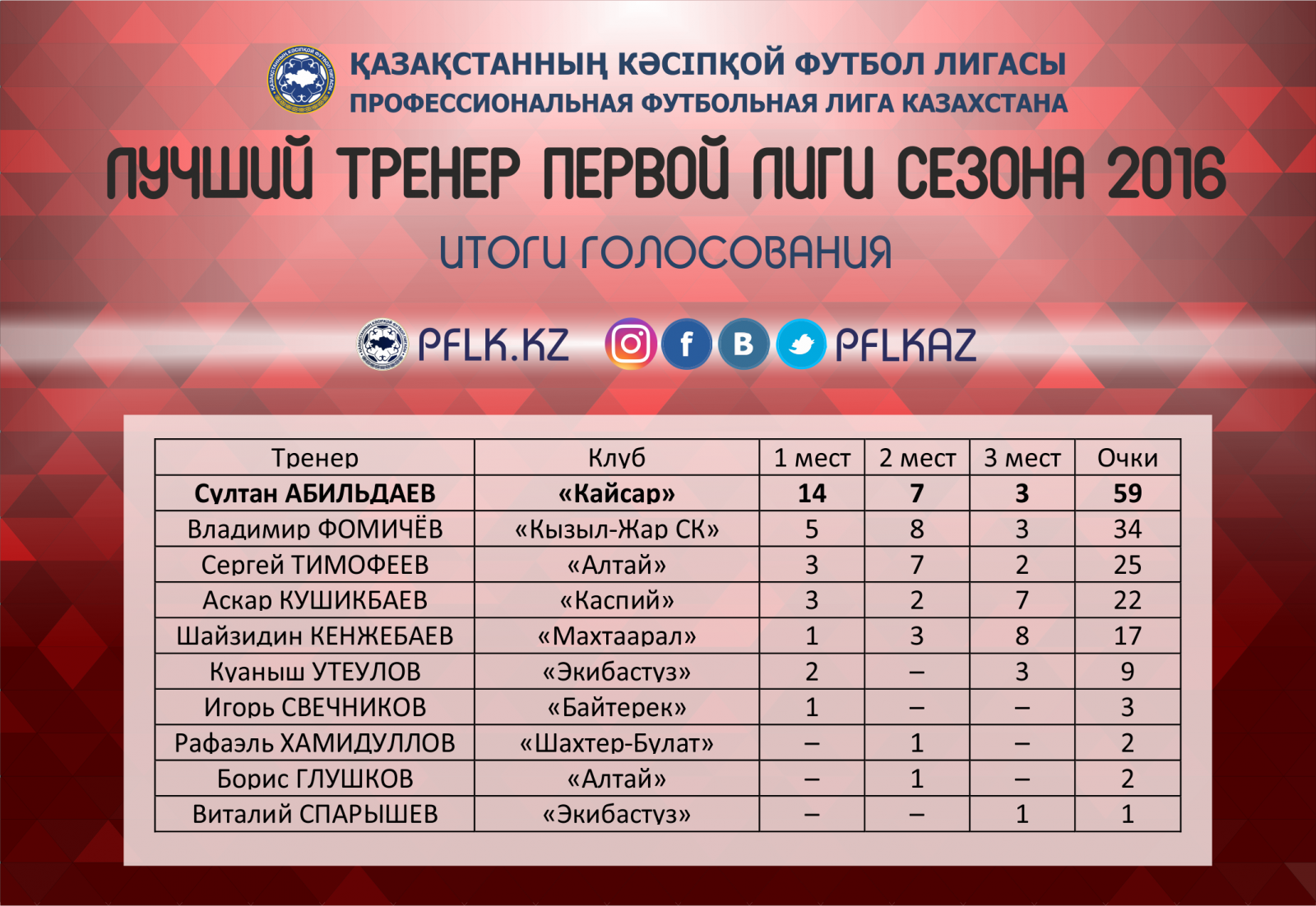 Звание «Лучшего тренера Первой Лиги» завоевал наставник «Кайсара» Султан Абильдаев, на счету которого 59 очков (14-7-3). Вторым стал главный тренер петропавловского «Кызыл-Жара СК» Владимир Фомичев – 34 балла (5-8-3). На третьем месте расположился Сергей Тимофеев (экс-тренер «Алтая») – 25 очков (3-7-2). (Кто за кого голосовал)