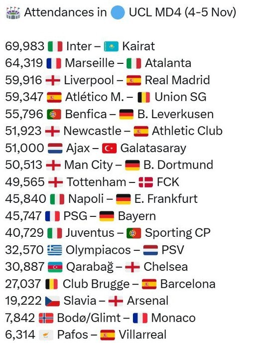 Второе место по посещаемости заняла игра «Марсель» – «Аталанта» (64 319), третье – «Ливерпуль» – «Реал Мадрид» (59 916). Далее следуют «Атлетико» – «Юнион» (59 347) и «Бенфика» – «Байер 04» (55 796). Всего в четвертом туре прошли 18 матчей.