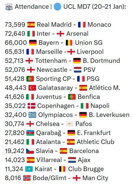 Наименьшее число болельщиков собрали игры «Вильярреал» – «Аякс» (14 023), «Кайрат» – «Брюгге» (11 324) и «Будё-Глимт» – «Манчестер Сити» (8 016).